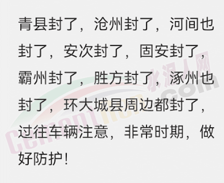 與唐山相鄰廊坊及天津早在19日前就通知執(zhí)行嚴(yán)格管控,有網(wǎng)友發(fā)消息提示過往車輛:青縣、滄州、河間、安次、固安、霸州、勝方、涿州等環(huán)大城縣周邊實(shí)施封控措施。