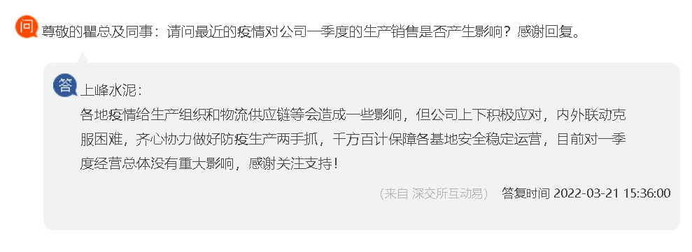 有投資者在上市平臺向上峰水泥問及疫情對公司一季度的生產(chǎn)銷售是否產(chǎn)生影響時(shí),上峰水泥回復(fù)稱,各地疫情給生產(chǎn)組織和物流供應(yīng)鏈等會(huì)造成一些影響,但公司上下積極應(yīng)對,內(nèi)外聯(lián)動(dòng)克服困難,齊心協(xié)力做好防疫生產(chǎn)兩手抓,千方百計(jì)保障各基地安全穩(wěn)定運(yùn)營。