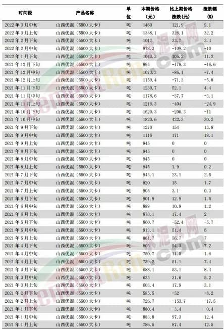 據(jù)水泥人網(wǎng)了解,煤價每變動100元,對水泥成本影響大約在10-15元/噸。以水泥企業(yè)燒成系統(tǒng)常用5000-5500大卡混煤為例,國家統(tǒng)計(jì)局?jǐn)?shù)據(jù),流通領(lǐng)域山西大混(5000大卡)2021年1月上旬為742.5元/噸,今年3月中旬為1310.8元/噸,上漲了568.3元/噸,漲幅約77%;山西優(yōu)混(5500大卡)2021年1月上旬為786.5元/噸,2022年3月中旬為1460元/噸,上漲了673.5元/噸,漲幅86%。