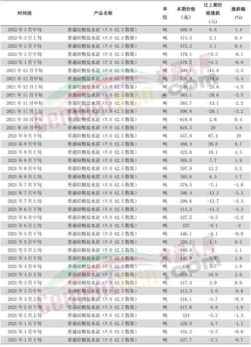 水泥企業(yè)為消化成本壓力,流通領(lǐng)域報(bào)價也出現(xiàn)上漲。2022年3月中旬普通硅酸鹽水泥(P.O 42.5散裝)為480.9元/噸,2021年1月上旬普通硅酸鹽水泥(P.O 42.5散裝)為437.7元/噸,上漲了43.2元/噸,漲幅9.87%。