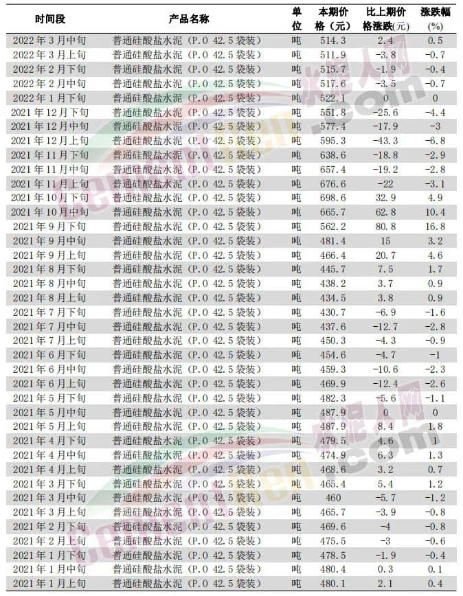 2022年3月中旬普通硅酸鹽水泥(P.O 42.5袋裝)為514.3元/噸,2021年1月上旬普通硅酸鹽水泥(P.O 42.5袋裝)為480.1元/噸,上漲了34.2,漲幅7.12%。煤價漲超50%,水泥卻未漲過10%。