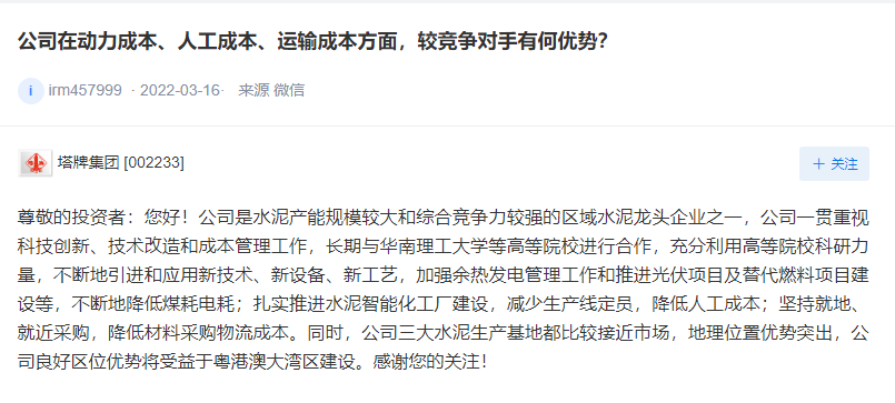 塔牌水泥表示,公司將繼續(xù)做強(qiáng)做精現(xiàn)有水泥主業(yè),通過加快推進(jìn)替代燃料、光伏儲能項(xiàng)目、分別粉磨配制水泥及智能工廠建設(shè)等措施積極節(jié)能減排降碳,不斷提高水泥主業(yè)競爭力。將不斷地引進(jìn)和應(yīng)用新技術(shù)、新設(shè)備、新工藝,加強(qiáng)余熱發(fā)電管理工作和推進(jìn)光伏項(xiàng)目及替代燃料項(xiàng)目建設(shè)等,不斷地降低煤耗電耗;扎實(shí)推進(jìn)水泥智能化工廠建設(shè),減少生產(chǎn)線定員,降低人工成本;堅(jiān)持就地、就近采購,降低材料采購物流成本。