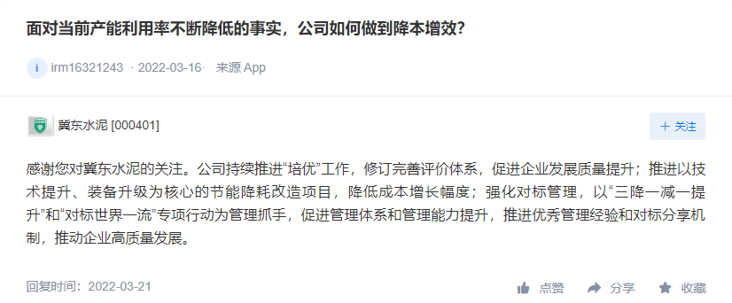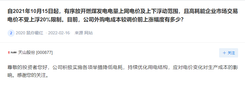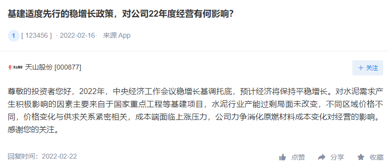 在應(yīng)對需求減少,成本增加方面,天山股份表示,2022年,中央經(jīng)濟(jì)工作會議穩(wěn)增長基調(diào)托底,預(yù)計(jì)經(jīng)濟(jì)將保持平穩(wěn)增長。對水泥需求產(chǎn)生積極影響的因素主要來自于國家重點(diǎn)工程等基建項(xiàng)目,水泥行業(yè)產(chǎn)能過剩局面未改變,不同區(qū)域價格不同,價格變化與供求關(guān)系緊密相關(guān),成本端面臨上漲壓力,公司力爭消化原燃材料成本變化對經(jīng)營的影響。針對電價上漲將積極實(shí)施各項(xiàng)舉措降低電耗,持續(xù)優(yōu)化用電結(jié)構(gòu),應(yīng)對電價變化對生產(chǎn)成本的影響。