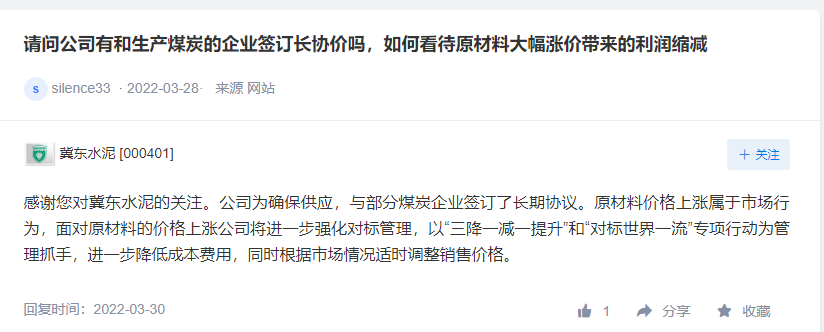 冀東水泥表示,公司為確保供應(yīng),與部分煤炭企業(yè)簽訂了長期協(xié)議。原材料價格上漲屬于市場行為,面對原材料的價格上漲公司將進(jìn)一步強(qiáng)化對標(biāo)管理,以“三降一減一提升”和“對標(biāo)世界一流”專項(xiàng)行動為管理抓手,進(jìn)一步降低成本費(fèi)用,同時根據(jù)市場情況適時調(diào)整銷售價格。公司將推進(jìn)以技術(shù)提升、裝備升級為核心的節(jié)能降耗改造項(xiàng)目,降低成本增長幅度。