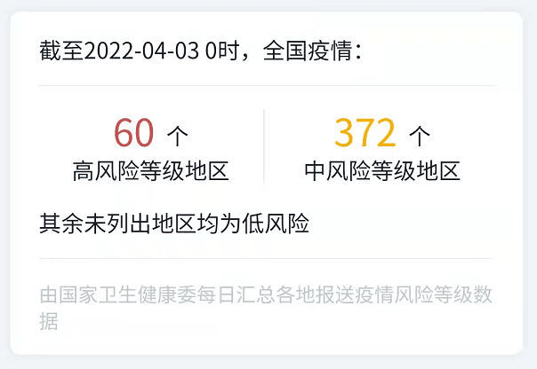 近期,全國疫情呈現(xiàn)局部高度聚集和多點散發(fā)態(tài)勢,截止4月3日0時,全國共有高風險等級地區(qū)60個,中風險等級地區(qū)372個。