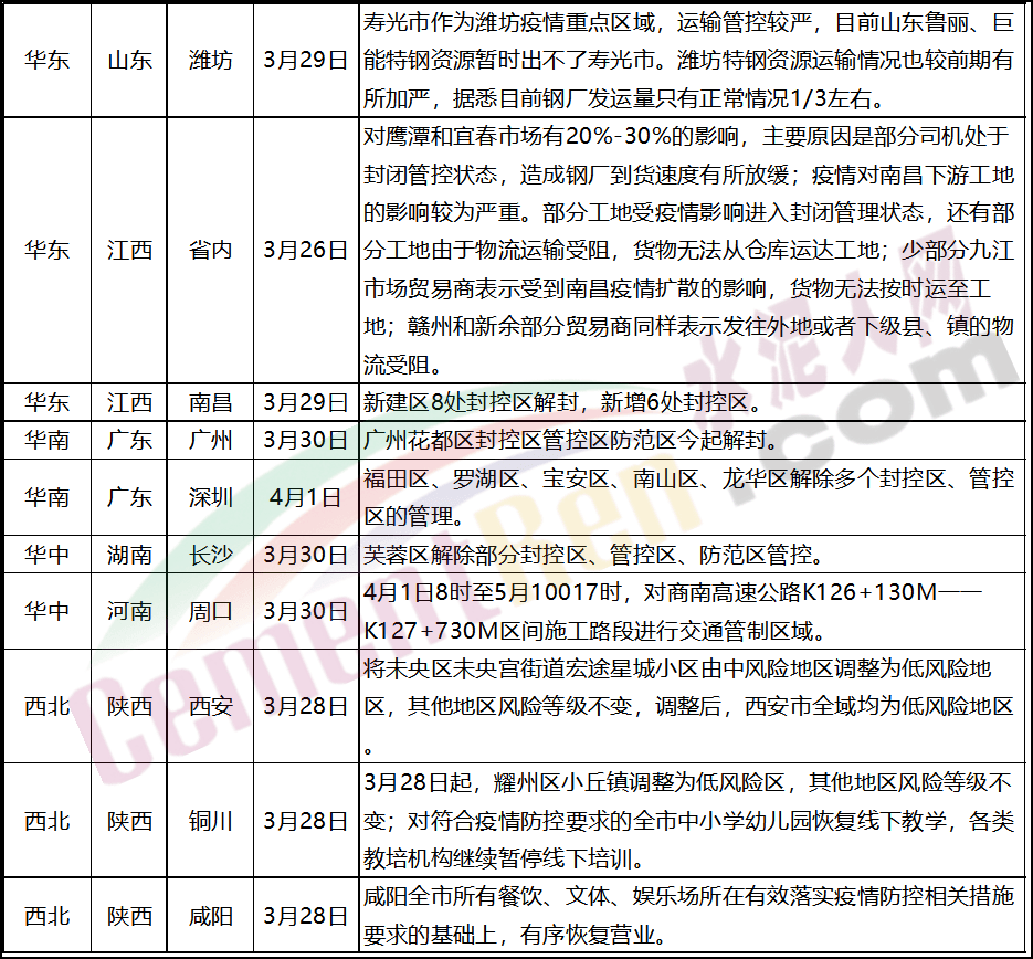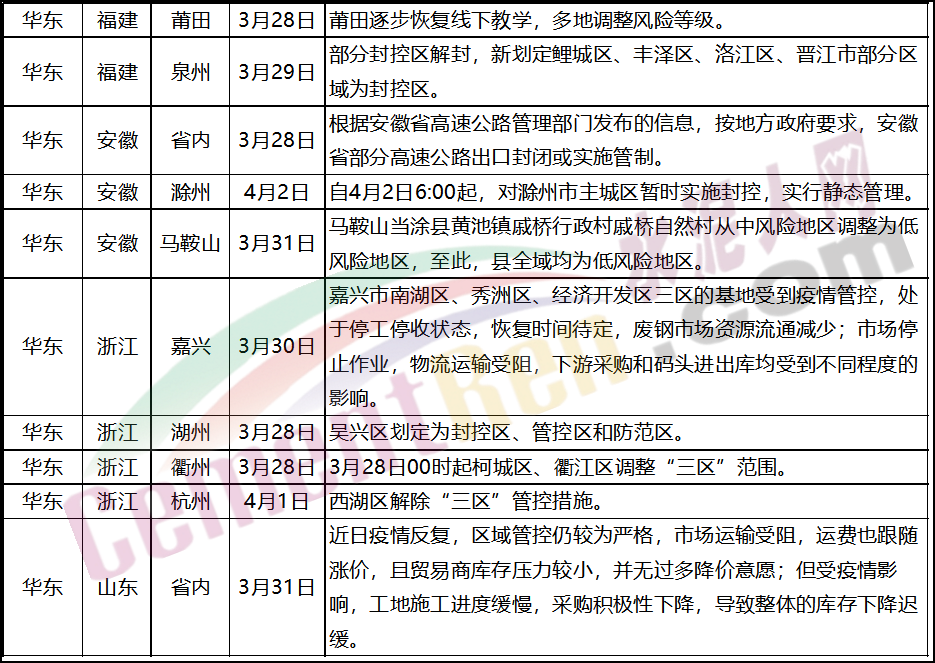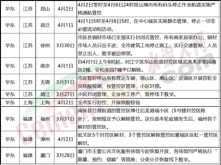 江蘇昆山4月2日零時至4月6日24時昆山境內(nèi)所有碼頭停止作業(yè)航道實施嚴格通航管控;江蘇宿遷4月1日5時至4月6日5時,在中心城區(qū)實施靜態(tài)管理,停止一切非必要流動和活動;安徽滁州自4月2日6:00起,對滁州市主城區(qū)暫時實施封控,實行靜態(tài)管理。