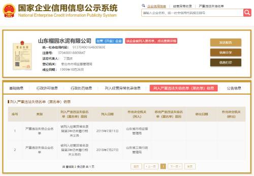 以山東榴園水泥有限公司為例,企業(yè)在2018年7月27日被山東省工商行政管理局列入嚴(yán)重違法失信企業(yè)名單,列入原因為被列入經(jīng)營異常名錄屆滿3年仍未履行相關(guān)義務(wù)。2019年7月11日再次被山東省市場監(jiān)督管理局列入嚴(yán)重違法失信企業(yè)名單,列入原因仍為被列入經(jīng)營異常名錄屆滿3年仍未履行相關(guān)義務(wù)。