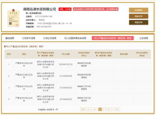 湖南泓溧水泥有限公司2018~2020年連續(xù)三年被列入嚴(yán)重違法失信企業(yè)名單 ,目前狀態(tài)為吊銷,未注銷。