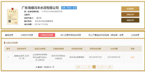 據(jù)查詢,上述企業(yè)中的廣東海螺鴻豐水泥有限公司為海螺水泥2021年11月剛剛接手控股的企業(yè),其行政處罰發(fā)生在2021年9月14日,違法類型為企業(yè)使用未獲得特種作業(yè)操作證的人員上崗作業(yè)。