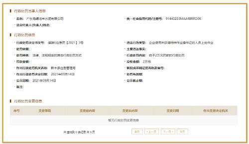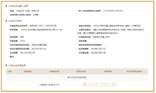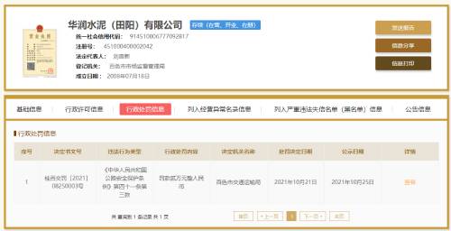 華潤水泥(田陽)有限公司在2021年10月21日被百色市交通運輸局罰款2萬元,主要違法事實為,當(dāng)事人在華潤水泥(田陽)有限公司地點實施了指使、強令車輛駕駛?cè)顺捱\輸貨物的違法行為。