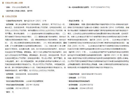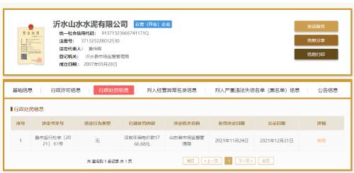沂水山水水泥有限公司2021年11月24日被山東省市場監(jiān)管局處罰。沒收環(huán)保電價款1766.68元。違法事實為當(dāng)事人涉嫌存在部分燃煤發(fā)電機組污染物排放濃度小時均值超限值仍享受環(huán)保電價的價格違法行為。