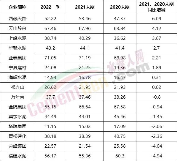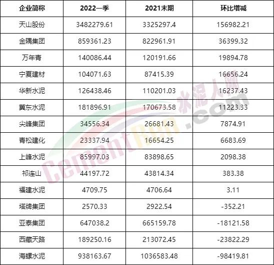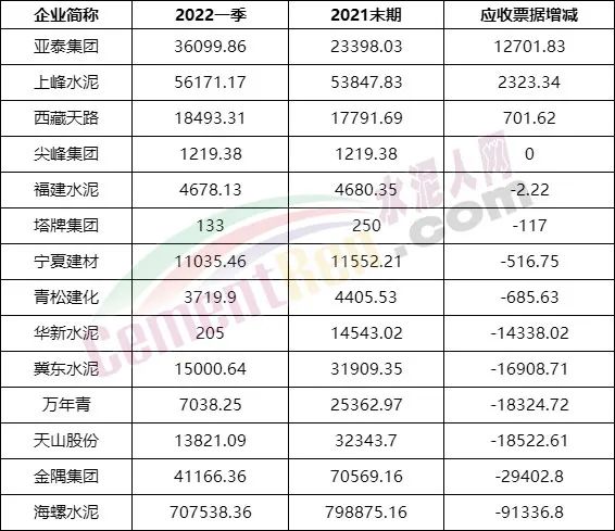 應(yīng)收賬款及票據(jù)方面,天山股份、金隅集團(tuán)、萬年青、寧夏建材、華新水泥、冀東水泥、尖峰集團(tuán)、青松建化、上峰水泥、祁連山、福建水泥等企業(yè)2022年一季度較上看末期環(huán)比均有不同幅度的增加。