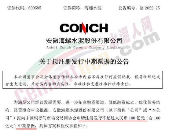 海螺水泥于6月16日晚間發(fā)布公告稱,為滿足公司經營發(fā)展需要,進一步拓寬融資渠道,降低融資成本,優(yōu)化債務結構,擬申請注冊發(fā)行不超過人民幣100億元中期票據。募集資金主要用于補充流動資金、償還有息債務和項目建設等符合國家法律法規(guī)規(guī)定的用途。