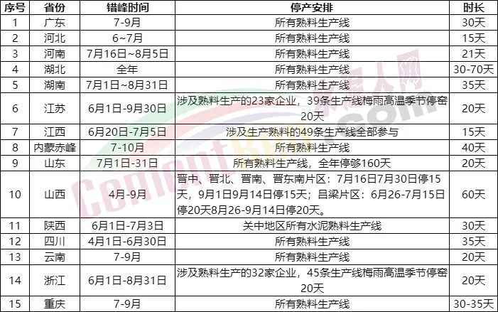 相關行業(yè)人士對水泥人網(wǎng)表示,不只河南區(qū)域,因熟料庫位相對較高,除部分企業(yè)選擇自主停窯外,山東、河北、湖南、江西等十余個省市地區(qū)已經(jīng)陸續(xù)發(fā)布了水泥行業(yè)夏季錯峰生產(chǎn)計劃。其中,山東熟料生產(chǎn)線7月計劃停窯20天、河北省熟料生產(chǎn)線7月停窯15天……