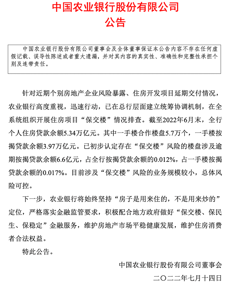 農(nóng)業(yè)銀行發(fā)布公告稱,針對(duì)近期個(gè)別房地產(chǎn)企業(yè)風(fēng)險(xiǎn)暴露、住房開(kāi)發(fā)項(xiàng)目延期交付情況,農(nóng)業(yè)銀行高度重視,迅速行動(dòng),已在總行層面建立統(tǒng)籌協(xié)調(diào)機(jī)制,在全系統(tǒng)組織開(kāi)展住房項(xiàng)目“保交樓”情況排查。
