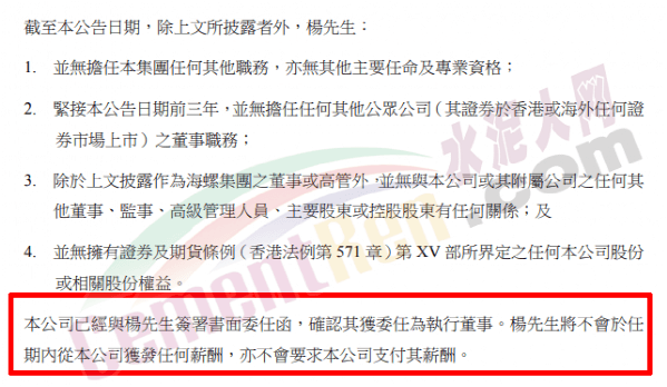 日前海螺水泥發(fā)布公告,董事會(huì)一致推選楊軍擔(dān)任第九屆董事會(huì)董事長(zhǎng)。且截至公告日楊軍并無(wú)擔(dān)任集團(tuán)任何其他職務(wù),亦無(wú)其他主要任命及專業(yè)資格。 且不擁有企業(yè)股份,也不從海螺水泥領(lǐng)工資,也不會(huì)要求海螺水泥發(fā)工資。