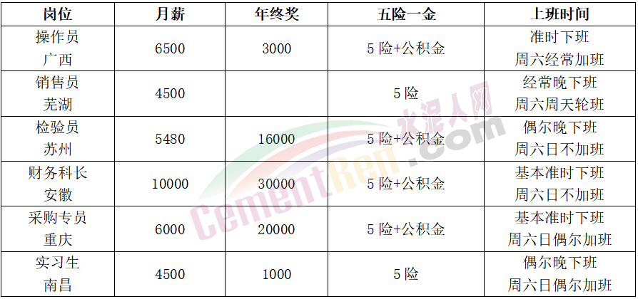 安徽海螺水泥股份有限公司員工表示:“漲不漲薪看運(yùn)氣,反正我進(jìn)來(lái)一年沒(méi)漲過(guò)。薪酬體系完善,但從不執(zhí)行,被考核倒是執(zhí)行得相當(dāng)麻溜,基本上留不住年輕人。但不得不說(shuō)對(duì)剛畢業(yè)的我,這點(diǎn)工資真的很對(duì)得起我。正在努力掙點(diǎn)錢,存點(diǎn)資本就溜,已經(jīng)到了就是給錢也不想留下的時(shí)候了。”
