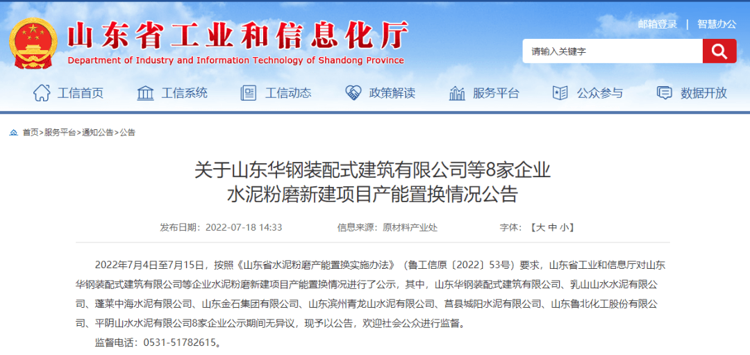 日前,山東省工信廳發(fā)布《關(guān)于山東華鋼裝配式建筑有限公司等8家企業(yè)水泥粉磨新建項目產(chǎn)能置換情況公告》稱,2022年7月4日至7月15日,按照《山東省水泥粉磨產(chǎn)能置換實施辦法》(魯工信原〔2022〕53號)要求,山東省工業(yè)和信息廳對山東華鋼裝配式建筑有限公司等企業(yè)水泥粉磨新建項目產(chǎn)能置換情況進行了公示,其中,山東華鋼裝配式建筑有限公司、乳山山水水泥有限公司、蓬萊中海水泥有限公司、山東金石集團有限公司、山東濱州青龍山水泥有限公司、莒縣城陽水泥有限公司、山東魯北化工股份有限公司、平陰山水水泥有限公司8家企業(yè)公示期間無異議。