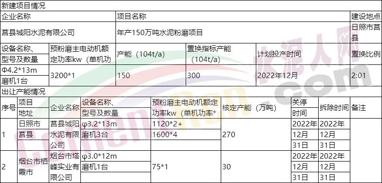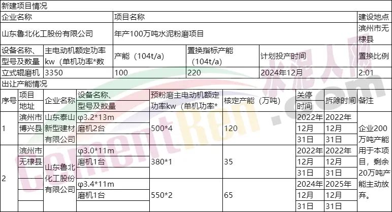 年產(chǎn)100萬噸水泥粉磨項目產(chǎn)能置換情況