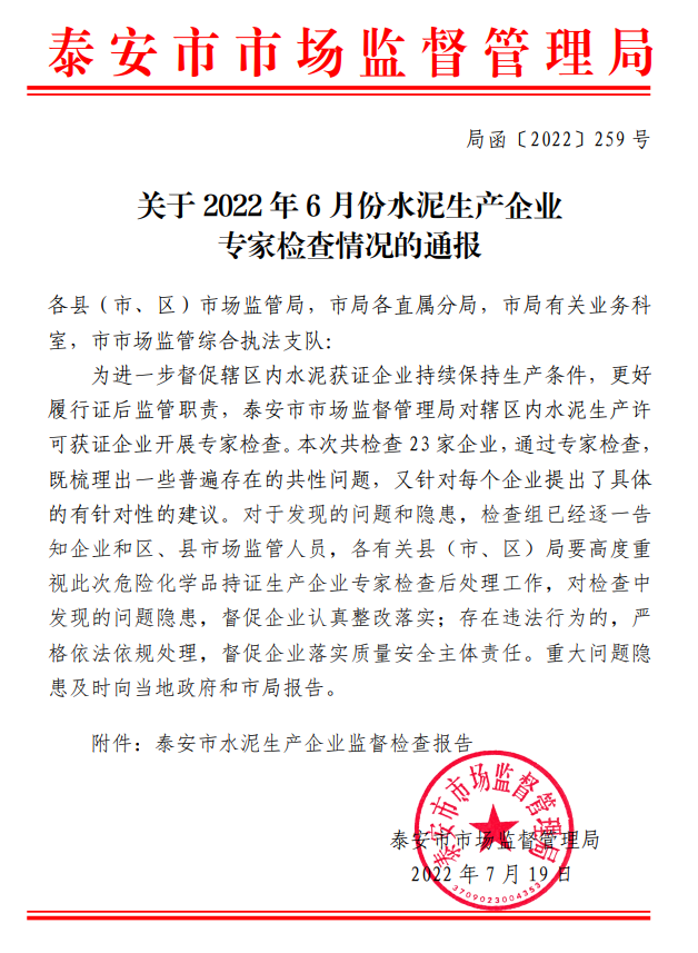 日前,山東泰安市場監(jiān)管局發(fā)布《關于2022年6月份水泥生產(chǎn)企業(yè)專家檢查情況的通報》稱,根據(jù)泰安市市場監(jiān)督管理局要求,2022年6月20日至6月27日,山東省建材工業(yè)協(xié)會從山東省建材行業(yè)專家?guī)斐榕尚袠I(yè)專家參與2022年泰安市水泥生產(chǎn)企業(yè)專家檢查工作。
