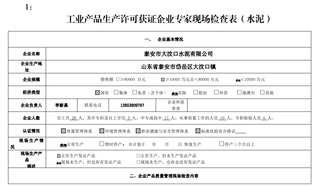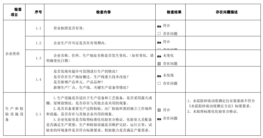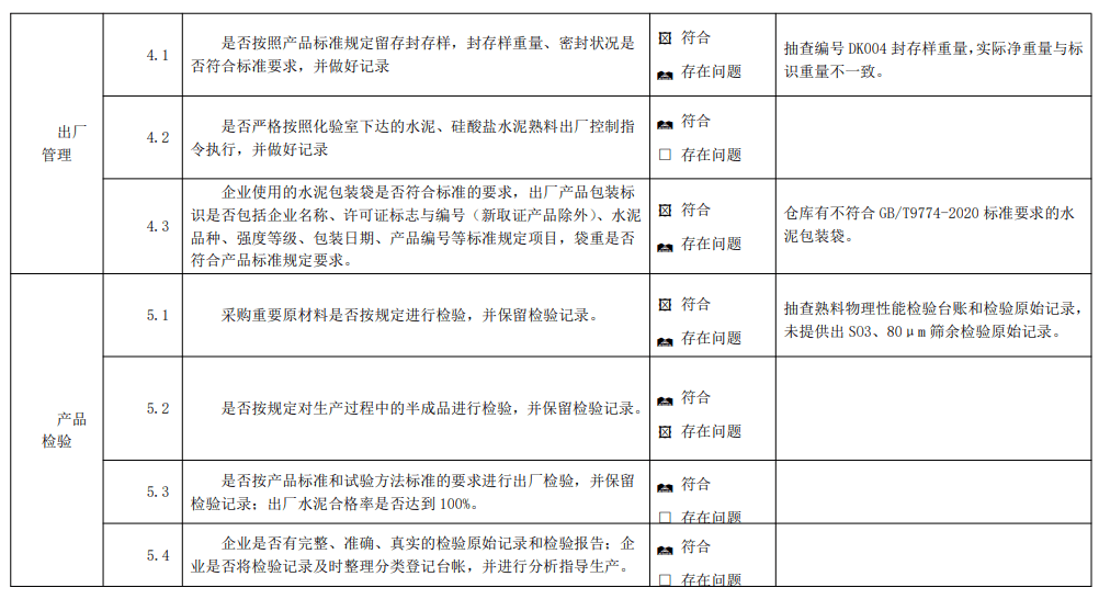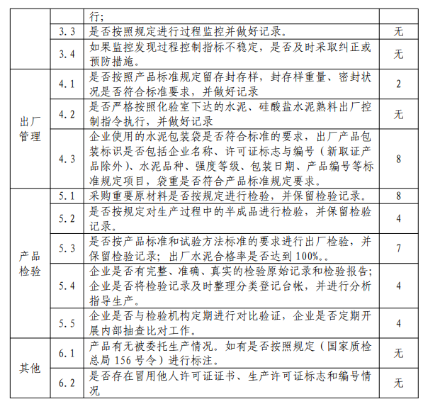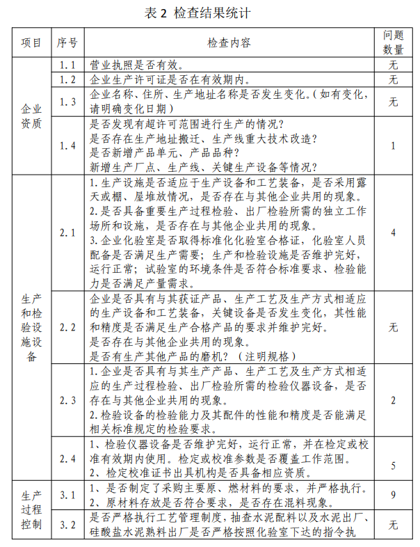 本次檢查為生產(chǎn)企業(yè)現(xiàn)場實地檢查,檢查范圍為泰安市工業(yè)產(chǎn)品生產(chǎn)許可獲證水泥企業(yè)(共計23家),檢查組由山東省建材工業(yè)協(xié)會的行業(yè)專家和市、區(qū)兩級市場監(jiān)管部門執(zhí)法人員組成,主要通過聽取企業(yè)匯報、查閱有關資料、詢問相關人員、巡視生產(chǎn)現(xiàn)場等形式,對獲證企業(yè)應當具備的資質(zhì)條件、質(zhì)量保證體系的建立和運行情況、生產(chǎn)工藝、產(chǎn)品質(zhì)量控制以及企業(yè)落實產(chǎn)品質(zhì)量、生產(chǎn)許可等政策法規(guī)情況進行檢查。檢查結(jié)束后,當場反饋檢查結(jié)果,提出整改意見和建議,并組織檢查人員、企業(yè)負責人及當?shù)乇O(jiān)管部門工作人員共同對檢查結(jié)果簽字確認。