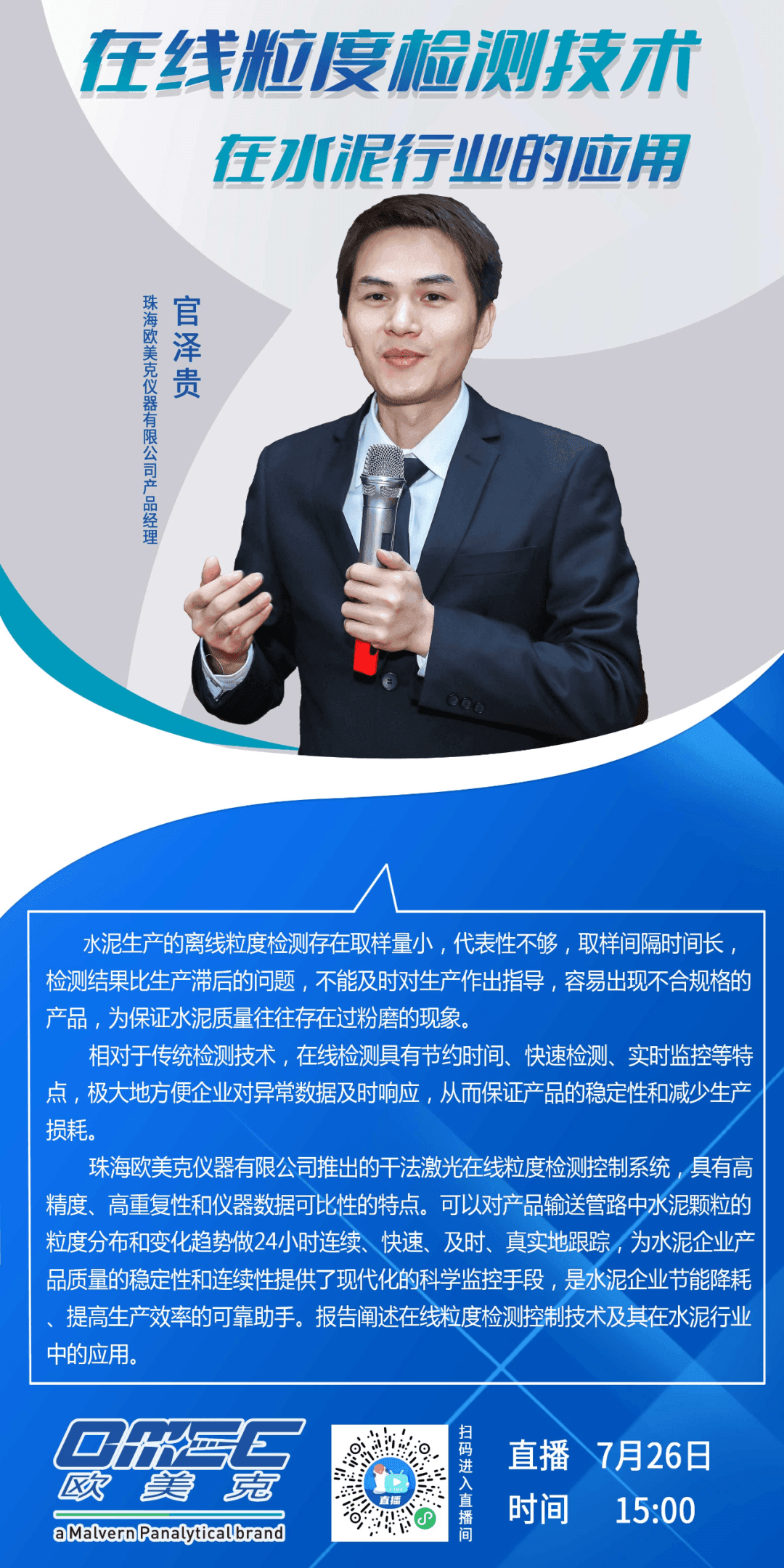 如何利用在線粒度檢測(cè)與控制系統(tǒng)幫助水泥、煤粉等多種工業(yè)在線檢測(cè)?請(qǐng)您在2022年7月26日15時(shí)前掃碼進(jìn)入直播間,聽(tīng)歐美克專業(yè)技術(shù)人員詳細(xì)講解……