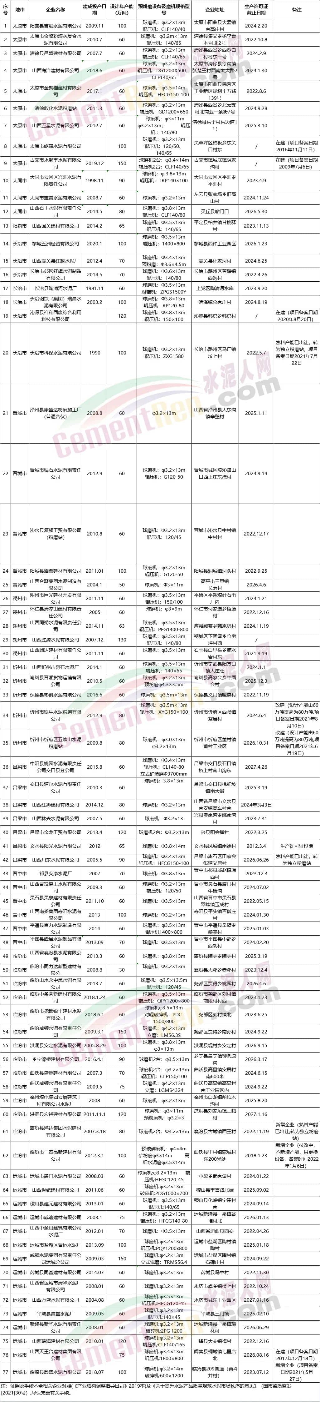 山西省獨立粉磨站生產(chǎn)線清單(2021年12月)