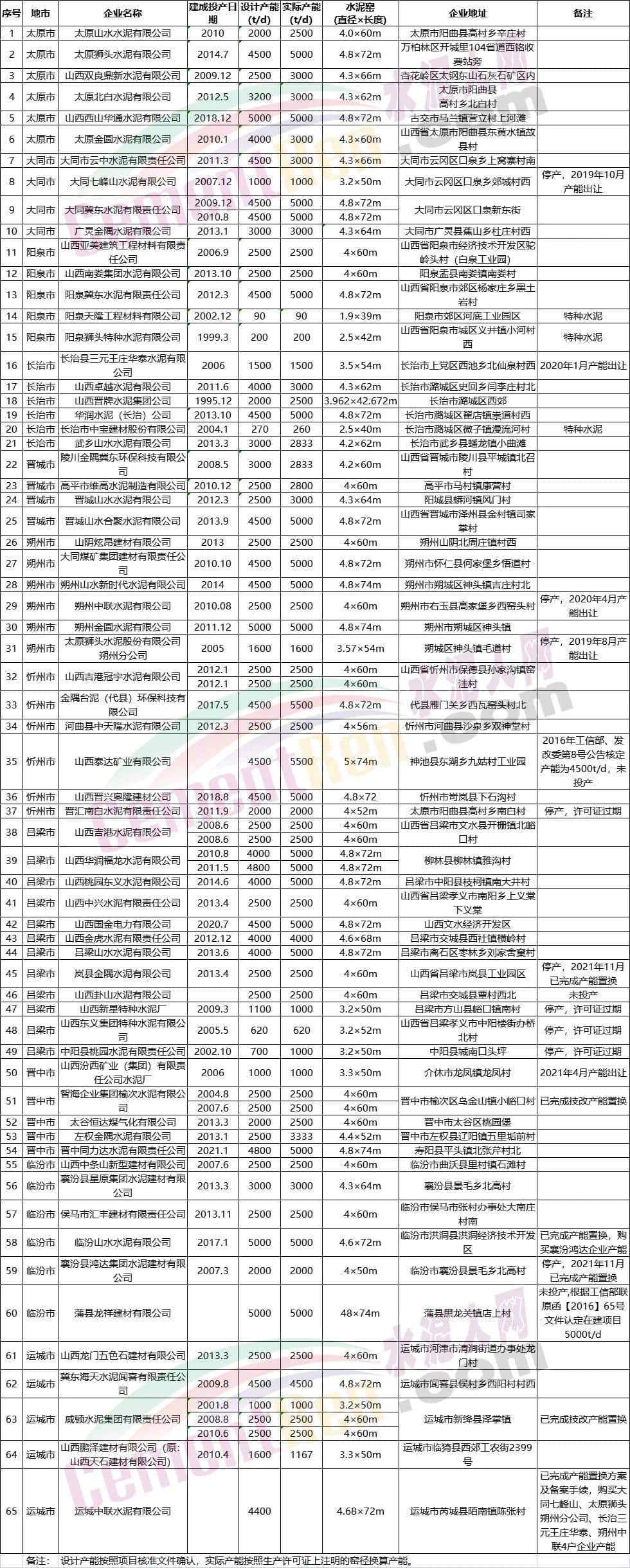 山西省水泥熟料生產(chǎn)線清單(截止2021年12月)