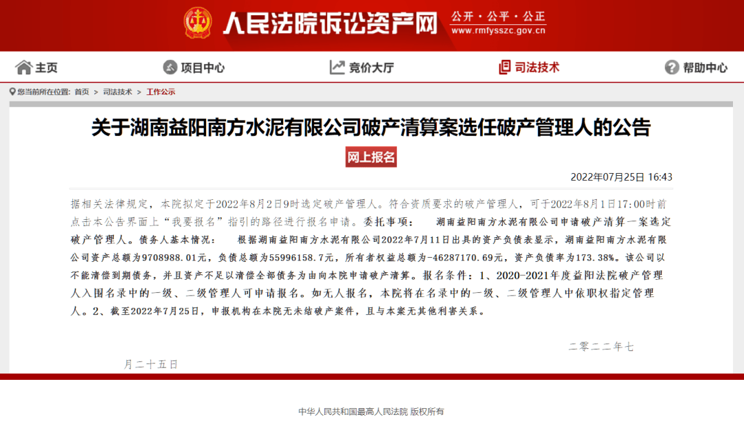 日前,人民法院訴訟資產(chǎn)網(wǎng)發(fā)布《關(guān)于湖南益陽南方水泥有限公司破產(chǎn)清算案選任破產(chǎn)管理人的公告》稱,據(jù)相關(guān)法律規(guī)定,法院擬定于2022年8月2日9時選定破產(chǎn)管理人。符合資質(zhì)要求的破產(chǎn)管理人,可于2022年8月1日17:00時前點(diǎn)擊本公告界面上“我要報名”指引的路徑進(jìn)行報名申請。
