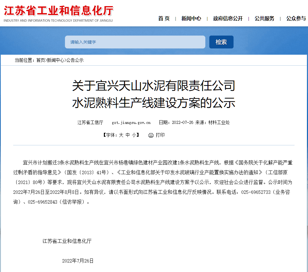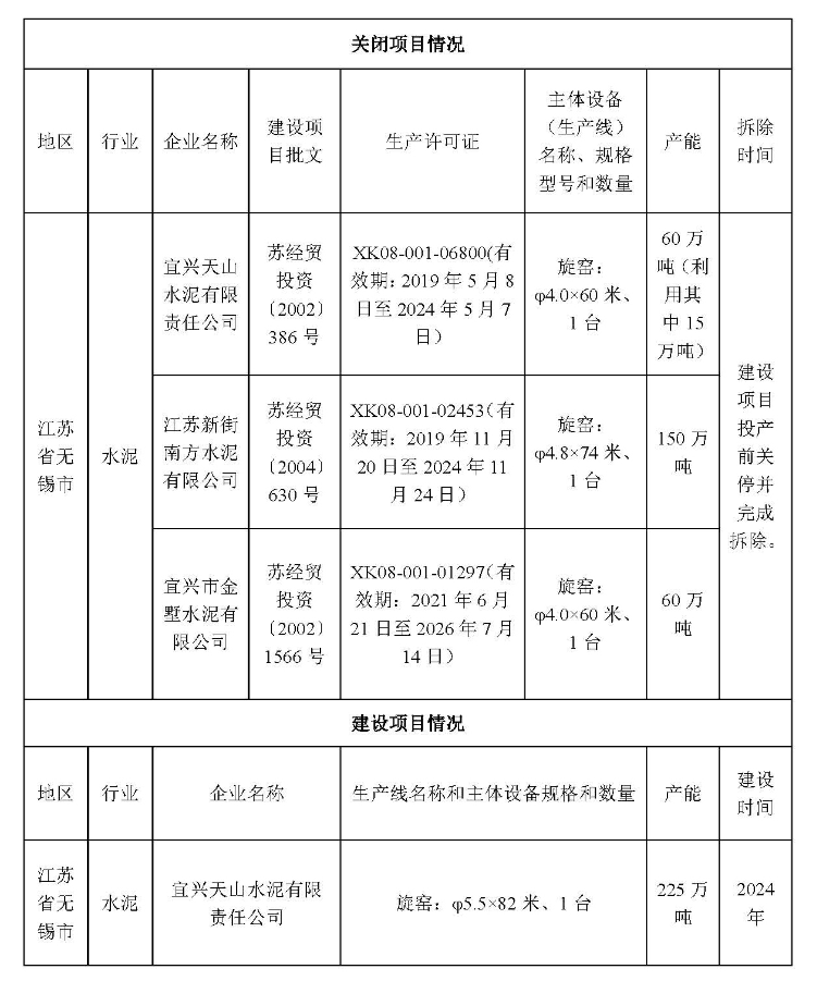 7月26日,江蘇省工信廳發(fā)布《關(guān)于宜興天山水泥有限責(zé)任公司水泥熟料生產(chǎn)線建設(shè)方案的公示》。公示內(nèi)容顯示,宜興天山水泥有限責(zé)任公司通過退出宜興天山水泥有限責(zé)任公司、江蘇新街南方水泥有限公司、宜興市金墅水泥有限公司各一條熟料生產(chǎn)線產(chǎn)能,在宜興市楊巷鎮(zhèn)綠色建材產(chǎn)業(yè)園新建1條水泥熟料生產(chǎn)線,生產(chǎn)線窯規(guī)格為5.5×82米,產(chǎn)能225萬噸/年,建設(shè)時(shí)間為2024年。