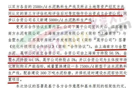 合作協(xié)議主要內(nèi)容:公司下屬子公司宜興天山、江蘇新街南方水泥有限公司、上海南方水泥有限公司與金墅水泥、江蘇晟宇房地產(chǎn)開發(fā)有限公司簽署《優(yōu)化升級(jí)項(xiàng)目合作協(xié)議》。由上海南方與金墅水泥、晟宇公司成立合資公司,合資公司由上海南方持股 50.5%、金墅水泥持股 44.5%、晟宇公司持股占 5%;并以合資公司為主體按市場(chǎng)化原則購買產(chǎn)能指標(biāo),減量置換建設(shè)一條 7500t/d 新型干法水泥熟料生產(chǎn)線,配套建設(shè) 300 萬噸水泥粉磨,并擇機(jī)適時(shí)建設(shè)水泥窯協(xié)同處置項(xiàng)目。