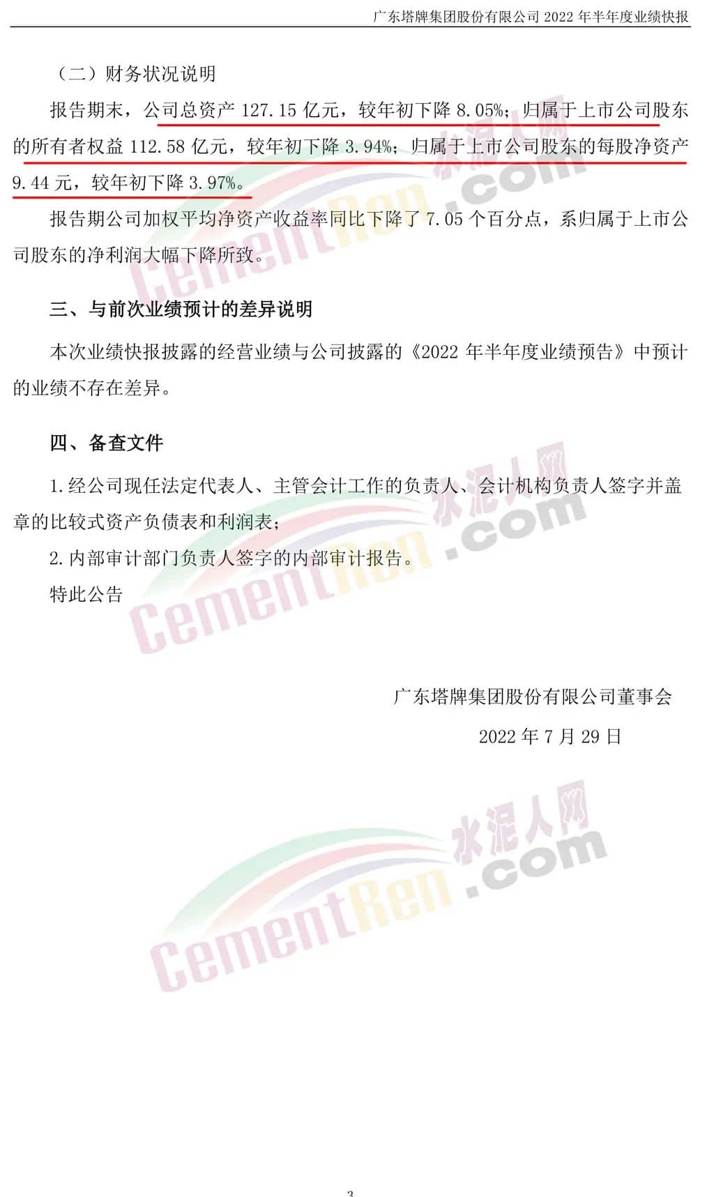 塔牌集團(tuán)(002233)7月28日晚間發(fā)布業(yè)績(jī)快報(bào),2022年半年度營(yíng)業(yè)收入為25.93億元,同比下滑28.64%;歸母凈利潤(rùn)1.75億元,同比下滑80.9%;基本每股收益0.15元。