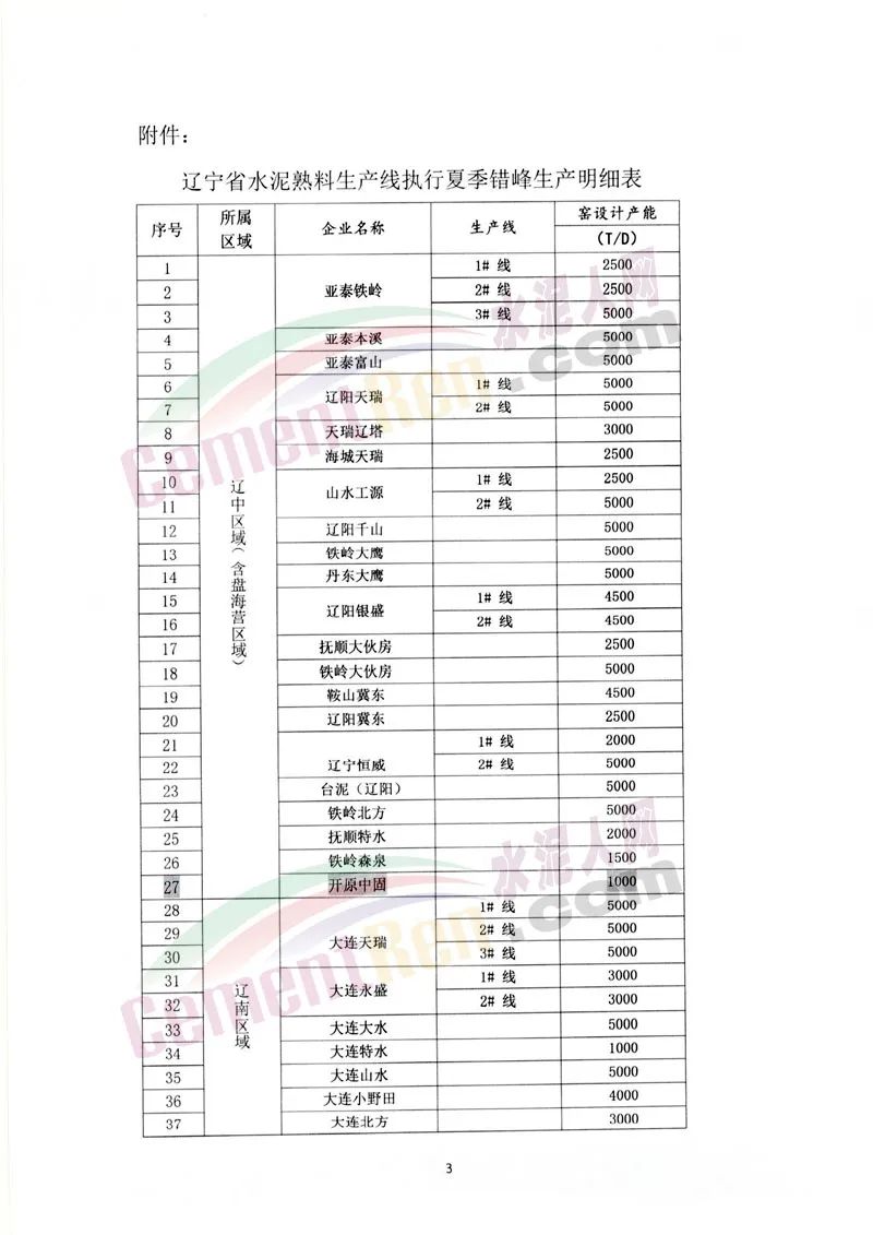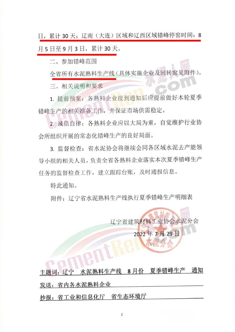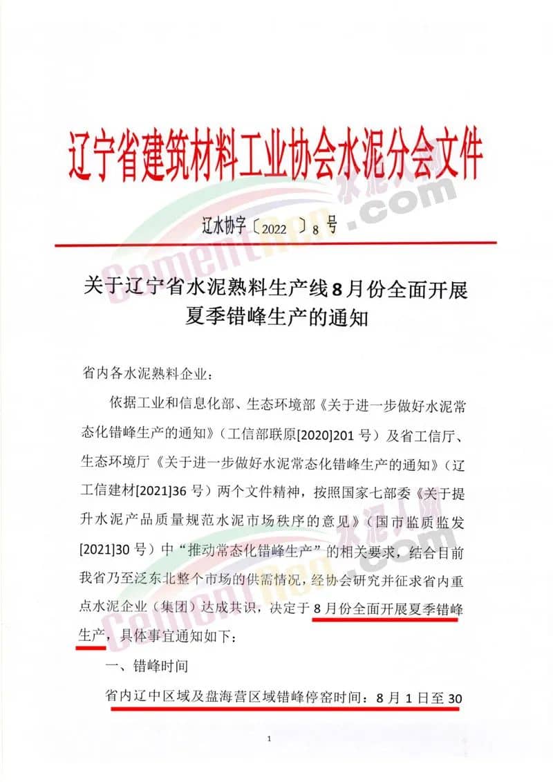 日前,遼寧省建筑材料工業(yè)協(xié)會(huì)水泥分會(huì)發(fā)布《關(guān)于遼寧省水泥熟料生產(chǎn)線8月份全面開(kāi)展夏季錯(cuò)峰生產(chǎn)的通知》給省內(nèi)各水泥熟料企業(yè)稱(chēng),依據(jù)相關(guān)文件要求,結(jié)合目前遼寧省乃至泛東北整個(gè)市場(chǎng)的供需情況,經(jīng)協(xié)會(huì)研究并征求省內(nèi)重點(diǎn)水泥企業(yè)(集團(tuán))達(dá)成共識(shí),決定全省所有水泥熟料生產(chǎn)線8月份全面開(kāi)展夏季錯(cuò)峰生產(chǎn)。遼中區(qū)域及盤(pán)海營(yíng)區(qū)域錯(cuò)峰停窯時(shí)間:8月1日至30日,累計(jì)30天;遼南(大連)區(qū)域和遼西區(qū)域錯(cuò)峰停窯時(shí)間:8月5日至9月3日,累計(jì)30天。