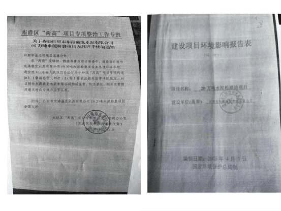 “在‘兩高’及鑄造、鍛造等重點項目排查中,排查出日照市東港盛發(fā)水泥有限公司60萬噸水泥粉磨項目未辦理環(huán)評手續(xù),請按照《山東省人民政府辦公廳關(guān)于加強(qiáng)‘兩高’項目管理的通知》(魯政辦字[2021]57號)要求及相關(guān)法律法規(guī)規(guī)定,對日照市東港盛發(fā)水泥有限公司加強(qiáng)監(jiān)管,依法查處。相關(guān)處置情況請及時向?qū)0噢k公室匯報。”