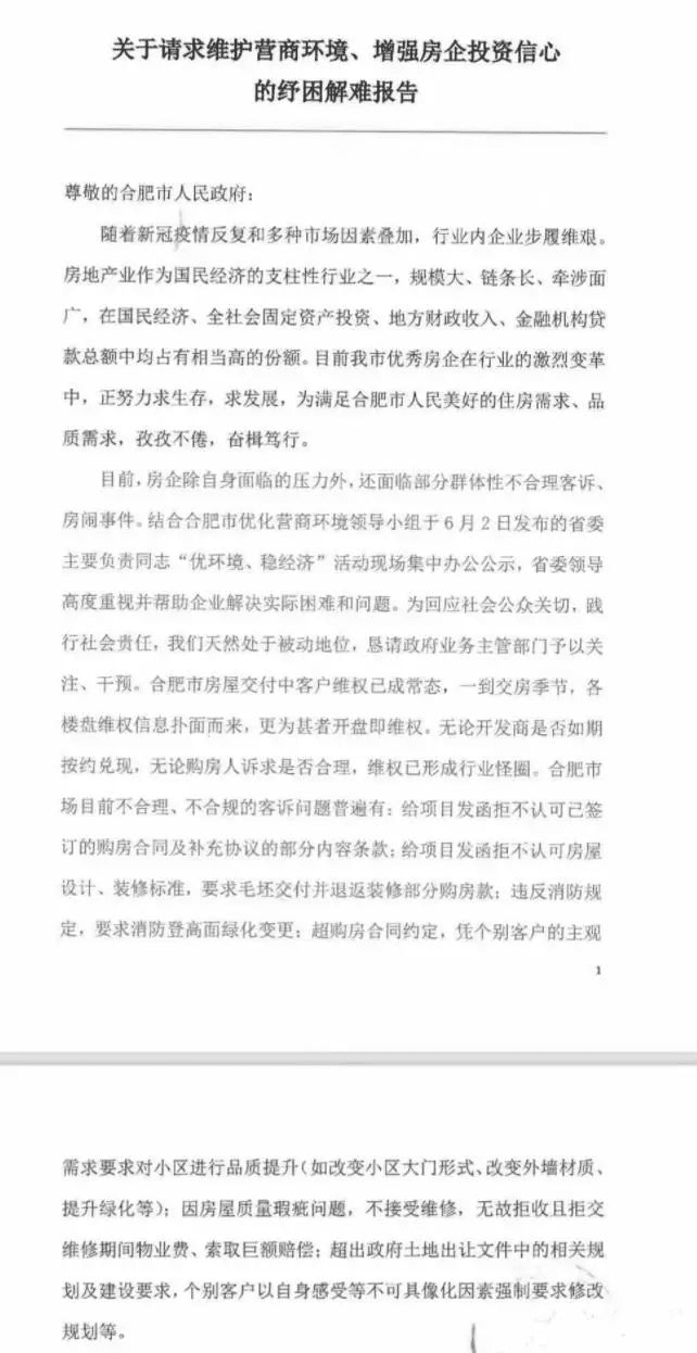近日,一份寫給合肥市政府的、名為《關(guān)于請求維護營商環(huán)境、增強房企投資信心的紓困解難報告》的文件流出,落款處蓋著保利、華潤、綠城、龍湖、融創(chuàng)、旭輝和葛洲壩等17家品牌房企的印章。報告請求合肥政府:堅決遏制專業(yè)房鬧及種種“惡意維權(quán)”行為。