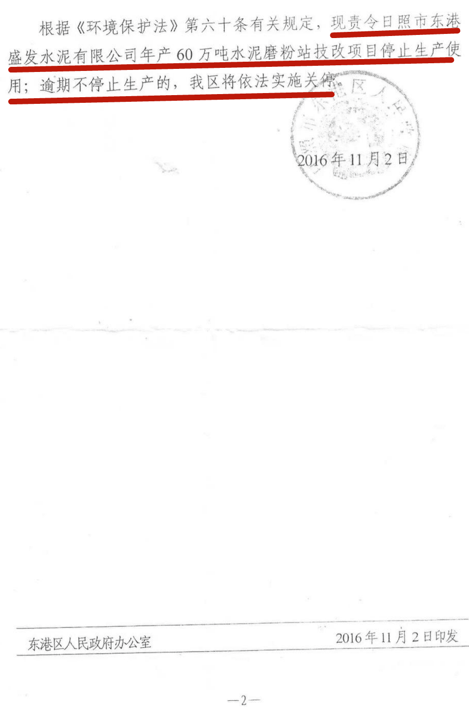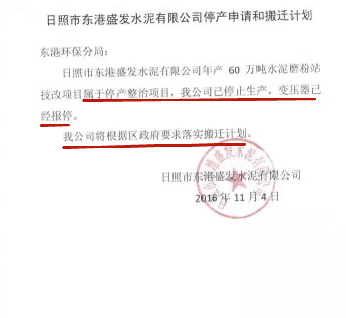 倒推時間軸,政府文件為證,2016年11月2號日照市東港區(qū)政府責(zé)令盛發(fā)停止生產(chǎn)的通知,11月4號企業(yè)上報區(qū)環(huán)保分局,明確:我公司將根據(jù)區(qū)政府要求落實(shí)搬遷計(jì)劃。