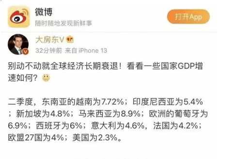 但是,對(duì)于部分媒體和吃瓜群眾在強(qiáng)調(diào)的“全球經(jīng)濟(jì)衰退”,有人是不同意的。新浪博主@大房東表示:別動(dòng)不動(dòng)就全球經(jīng)濟(jì)長(zhǎng)期衰退,看看一些國(guó)家GDP增速如何?