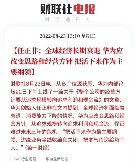 近日,華為創(chuàng)始人任正非在內(nèi)部發(fā)文中提到:全球經(jīng)濟(jì)面臨著衰退、消費(fèi)能力下降的情況,華為應(yīng)該改變思路和經(jīng)營(yíng)方針,從追求規(guī)模轉(zhuǎn)向追求利潤(rùn)和現(xiàn)金流,保證渡過(guò)未來(lái)三年的危機(jī)。“把活下來(lái)作為最主要綱領(lǐng),邊緣業(yè)務(wù)全線收縮和關(guān)閉,把寒氣傳遞給每個(gè)。”