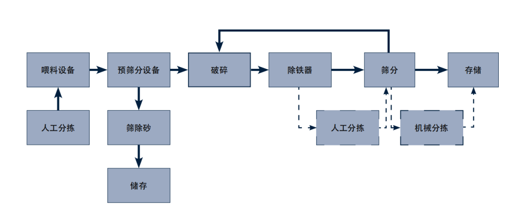 而建筑垃圾本身可以作為砂石骨料生產(chǎn)的半成品直接進(jìn)行利用,簡單來講,要想將建筑垃圾在建材產(chǎn)業(yè)鏈中變廢為寶,只需做好“篩分+破碎”這兩大工序即可。
