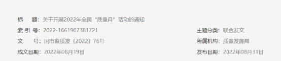 日前,國(guó)家市場(chǎng)監(jiān)管總局發(fā)布《關(guān)于開(kāi)展2022年全國(guó)“質(zhì)量月”活動(dòng)的通知》(國(guó)市監(jiān)質(zhì)發(fā)〔2022〕76號(hào))提到,市場(chǎng)監(jiān)管總局等21個(gè)部門(mén)定于2022年9月聯(lián)合開(kāi)展全國(guó)“質(zhì)量月”活動(dòng)?;顒?dòng)主題為“推動(dòng)質(zhì)量變革創(chuàng)新 促進(jìn)質(zhì)量強(qiáng)國(guó)建設(shè)”。