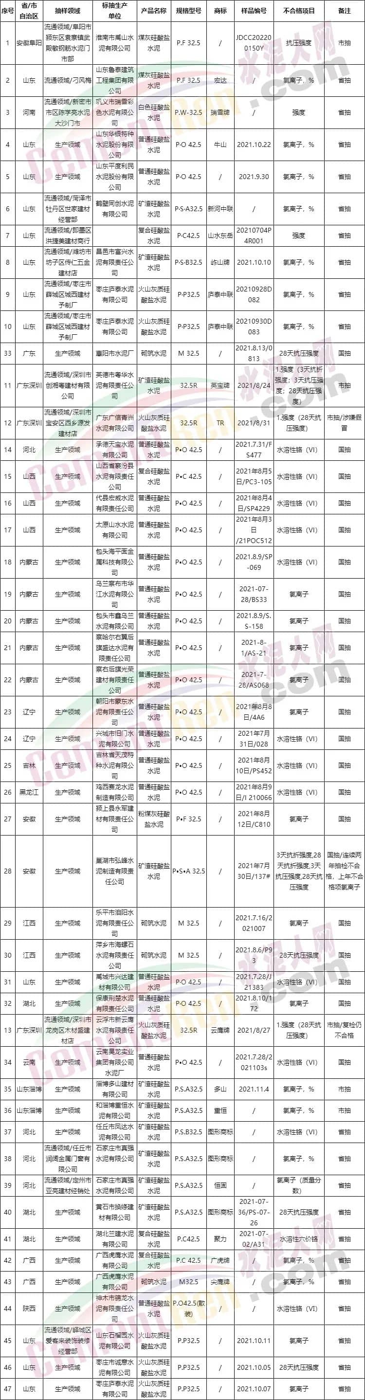 47批不合格水泥,32.5標(biāo)號(hào)占比超50%,不合格項(xiàng)目涉及強(qiáng)度、氯離子水溶性鉻