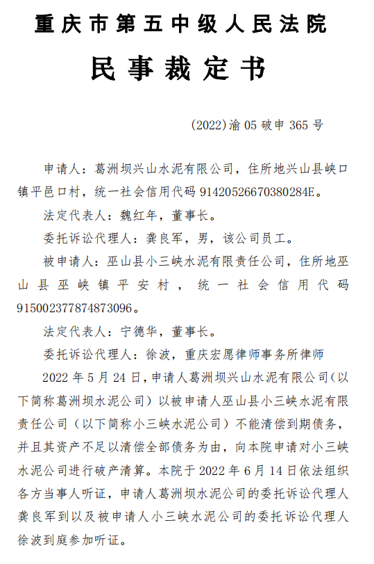 日前,重慶市第五中級人民法院發(fā)布的(2022)渝05破申365號《民事裁定書》提到,2022年5月24日,葛洲壩興山水泥有限公司以被申請人巫山縣小三峽水泥有限責(zé)任公司不能清償?shù)狡趥鶆?wù),并且其資產(chǎn)不足以清償全部債務(wù)為由,向重慶市第五中級人民法院申請對小三峽水泥公司進(jìn)行破產(chǎn)清算。