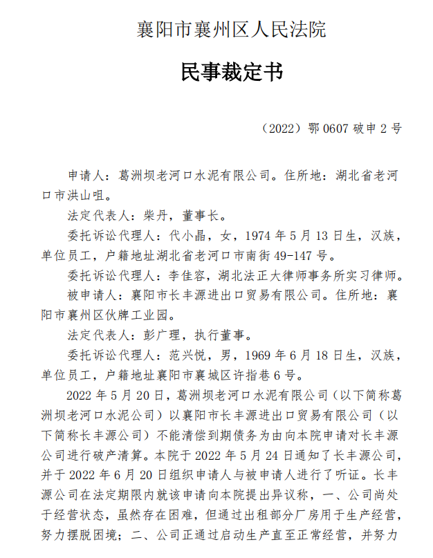 同期,湖北襄陽市襄州區(qū)人民法院發(fā)布(2022)鄂 0607 破申 2 號《民事裁定書》提到,2022 年 5 月 20 日,葛洲壩老河口水泥有限公司以襄陽市長豐源進(jìn)出口貿(mào)易有限公司不能清償?shù)狡趥鶆?wù)為由向本院申請對長豐源公司進(jìn)行破產(chǎn)清算。法院于 2022 年 5 月 24 日通知了長豐源公司,并于 2022 年 6 月 20 日組織申請人與被申請人進(jìn)行了聽證。