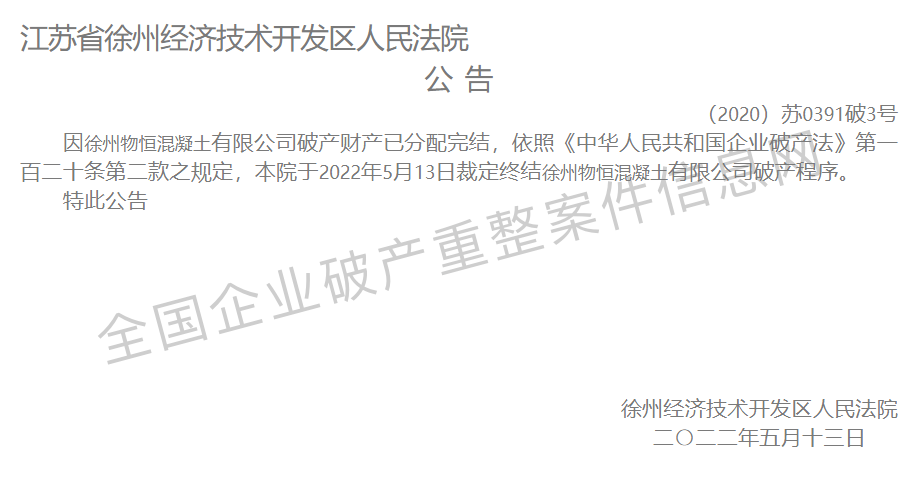 因徐州物恒混凝土有限公司破產(chǎn)財產(chǎn)已分配完結(jié),依照《中華人民共和國企業(yè)破產(chǎn)法》第一百二十條第二款之規(guī)定,江蘇省徐州經(jīng)濟(jì)技術(shù)開發(fā)區(qū)人民法院于2022年5月13日裁定終結(jié)徐州物恒混凝土有限公司破產(chǎn)程序。