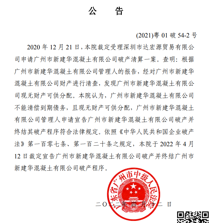 2022年4月12日廣東省廣州市中級人民法院認(rèn)為,廣州市新建華混凝土有限公司不能清償?shù)狡趥鶆?wù),且現(xiàn)無財產(chǎn)可供分配,廣州市新建華混凝土有限公司管理人申請宣告廣州市新建華混凝土有限公司破產(chǎn)并終結(jié)其破產(chǎn)程序符合法律規(guī)定。
