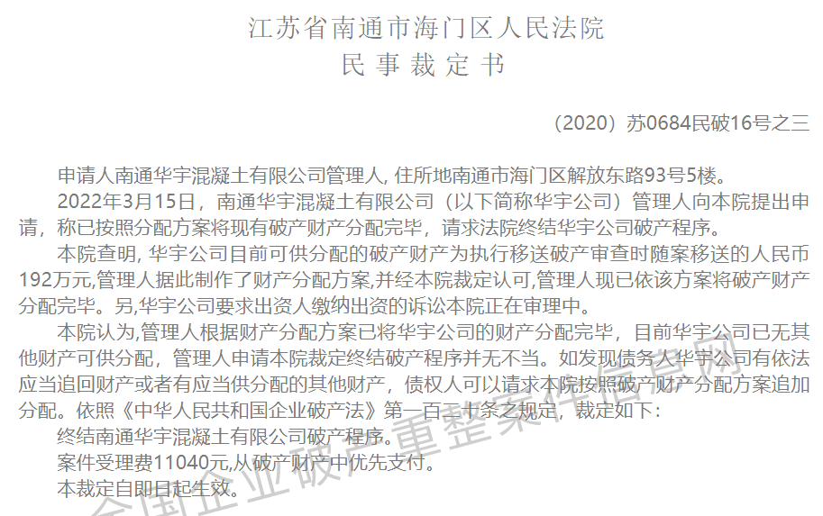 江蘇省南通市海門區(qū)人民法院于2022年3月22日裁定宣告南通華宇混凝土有限公司破產(chǎn)。