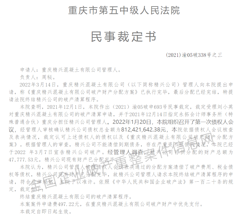 2022年3月14日,重慶精興混凝土有限公司管理人向重慶市第五中級人民法院提出申請,稱《重慶精興混凝土有限公司破產(chǎn)財產(chǎn)分配方案》已執(zhí)行完畢,最后分配已經(jīng)完結(jié),特提請法院終結(jié)精興公司的破產(chǎn)清算程序。
