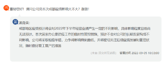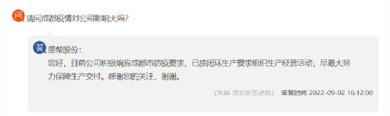 盛幫股份回復(fù),目前公司積極響應(yīng)成都市防疫要求,已按閉環(huán)生產(chǎn)要求組織生產(chǎn)經(jīng)營活動,盡最大努力保障生產(chǎn)交付。