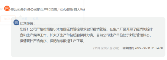 鹽湖股份回復(fù):公司嚴格按照格爾木地區(qū)疫情管控要求做好疫情管控,在生產(chǎn)廠區(qū)開展了疫情防控排查和生產(chǎn)保障工作,加大了生產(chǎn)單位后勤保障力度。目前公司生產(chǎn)單位處于封閉管理狀態(tài),疫情管控嚴格有序,鉀肥和碳酸鋰生產(chǎn)正常。