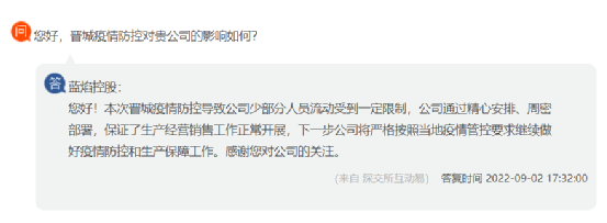 山西晉城藍焰控股回復(fù)本次晉城疫情防控導(dǎo)致公司少部分人員流動受到一定限制,公司通過精心安排、周密部署,保證了生產(chǎn)經(jīng)營銷售工作正常開展,下一步公司將嚴格按照當(dāng)?shù)匾咔楣芸匾罄^續(xù)做好疫情防控和生產(chǎn)保障工作。